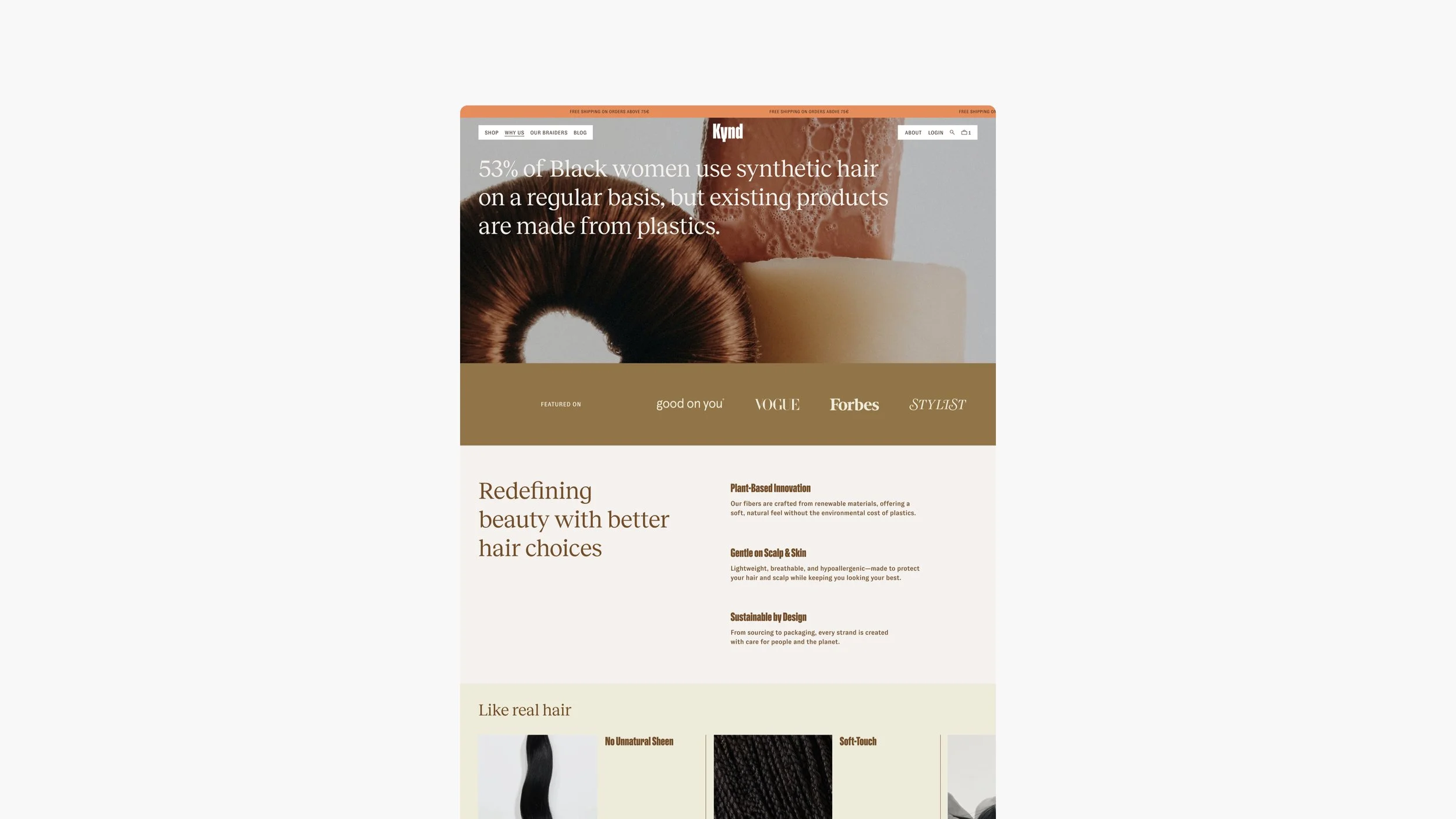 Kynd Hair is a hair extensions brand re-inventing how extensions and braids are produced. 53% of black women use synthetic hair, yet existing products are mostly plastic based. The ingredients and derivatives end up being toxic and harmful to the scalp and ultimately excess waste. Made out of Lyocell, Kynd Hair extensions are plant-based, they look and feel more natural and have a clear low to zero environmental impact for a more safe and circular solution.